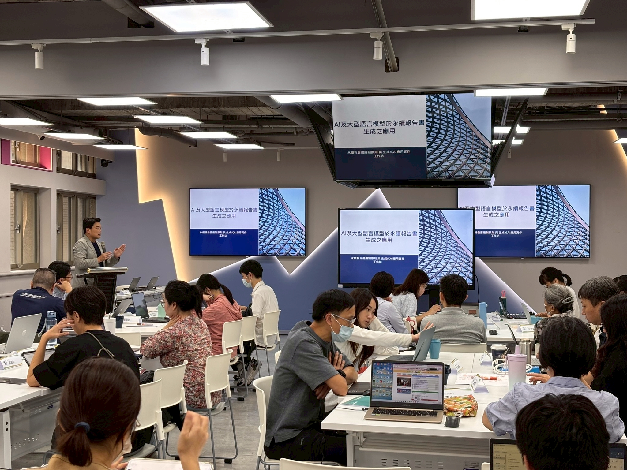 下午場主講人黃凱斌助理教授以實務導向的方式,帶領學員深入了解 AI 輔助永續報告書編制的完整流程,並進行高互動性的「動手實作」體驗。課程內容涵蓋了永續報告書的產業痛點與 LLM 賦能,介紹RAG 技術核心,並實際演示從文件切片到自動修正的 AI 應用步驟,為企業提供了數位化編制報告的完整方案。以下摘要工作坊精華內容: